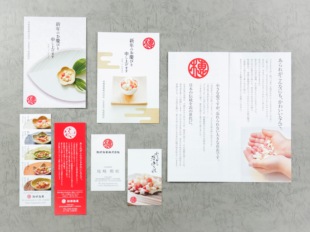岐阜県美濃加茂市にある、老舗の製菓会社・初穂製菓株式会社さん。こちらも、私の創業当初からのお得意様です。関市と同じ岐阜の田舎ながら、もとは東京の一流百貨店でしか買えなかった、高級あられを主につくられている会社さん。早くから通信販売をされていたため、弊社も、その通販DMのお手伝いと、ウェブサイトの構築をきっかけに、パッケージ、POPなど、幅広いお付き合いをいただいています。毎年、お得意様向けの、季節ごとに行うDMシリーズのカタログ制作とその周辺の販促活動を担当しています。
