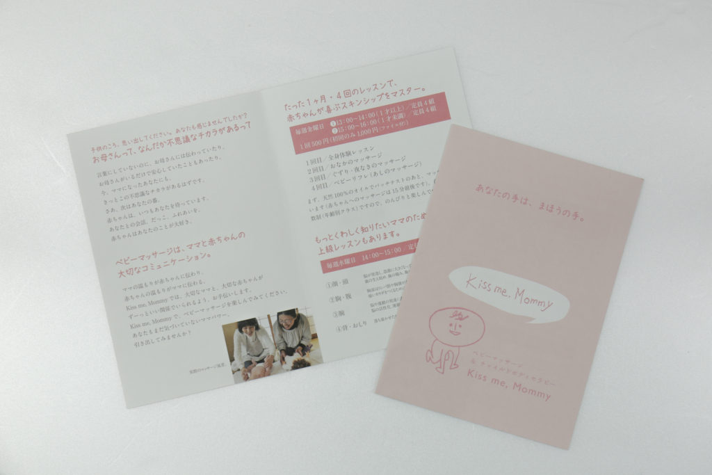 自宅で行なう赤ちゃんマッサージサービスのためのロゴ、イメージイラスト、ミニパンフレット、名刺を作成しました。